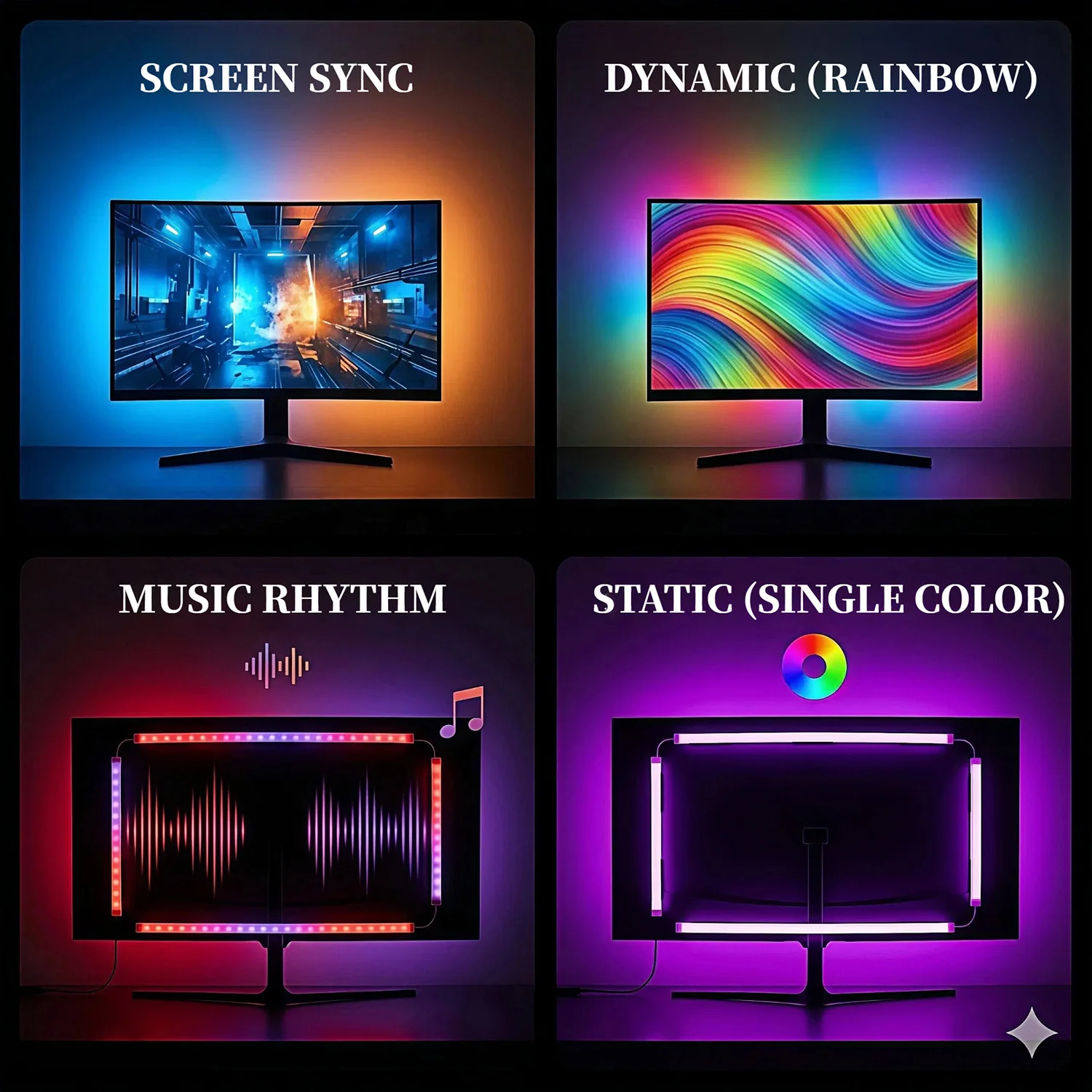 4 PRO MODES + AI CONTROL: Toggle between Screen Sync, Music Rhythm, Chasing Illusion, and Static Color. Use the AI Prompt feature to type your vibe (e.g., "Deep Sea") and generate custom lighting.